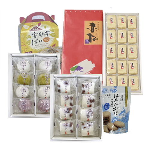 人気商品の塩豆かるかん8個入り、かるかん饅頭3色8個入り、赤松せんべい15袋入り、新商品の安納芋ぱい4個入り、かつおクッキー「はえんかぜ」の計5点、5,000円のお得なセットです。